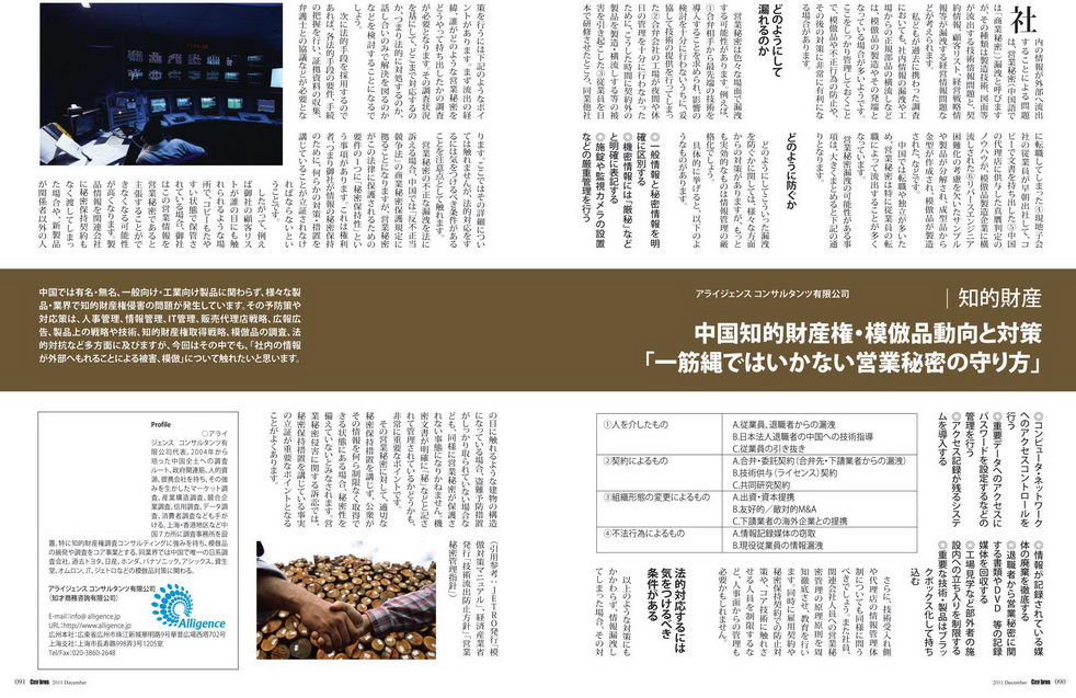 2011年12月の 「Brosビジネス」へ下記の通り弊社の記事が掲載されました。 中国知的財産権・模倣品動向と対策 「一筋縄ではいかない営業秘密の守り方」 中国では現状として、有名・無名、一般向け・工業向け製品に関わらず、様々な製品・業界で知的財産権侵害の問題が発生しています。その予防策や対応策はというと、人事管理、情報管理、IT管理、販売や代理店戦略、広報広告、製品上の戦略や技術、知的財産権取得戦略、模倣品の調査と法的対抗など多方面の話題に及びますが、今回は一つだけその中でも、予防と対策の一番初めに考えられる、「社内の情報が外部へもれることによる被害、模倣」について触れたいと思います。 社内の情報が外部へ流出する事による問題は、営業秘密(中国語では「商業秘密」)漏洩などと呼びますが、その種類は技術情報である製造技術、図面等が流出する問題と、経営情報である契約情報、顧客リスト、経営戦略情報等が漏洩する問題などが考えられます。私共が過去携わった事のある調査においても、社内情報の漏洩や正規部品の工場からの不正横流しなどは、様々な場面で模倣品の製造や、その前触れとしての問題の発端となっている場合が多いようです。ここをしっかり管理しておく事で、模倣品や不正行為の防止や、その後の対策に非常に有利になる場合があります。 どのようにして漏れるのか 営業秘密は気をつけないと色々な場面で漏洩する可能性が潜んでいます。例えば、合弁相手から、最先端の技術を導入することを求められ、十分な影響の検討を行わないうちに、妥協して技術の提供を行ってしまった、合弁会社の工場が夜間や休日の管理を十分に行わなかったために、こうした時間に契約外の製品を製造・横流しする等の被害を引き起こした、従業員を日本で研修させたところ、同業他社に転職してしまった、現地子会社の従業員が毎早朝出社してコピーにより文書を持ち出した、中国の代理店に供与した真贋判定のノウハウが、模倣品製造企業に横流しされた、リバースエンジニアの困難化の考慮を欠いたサンプルや製品が分解されて成型品から金型が作成され、模倣品が製造された、など。特に営業秘密は従業員の転職等によって流出することが多く、中国では転職や独立が多いため、その分、営業秘密の保護が重要です。営業秘密が漏洩する可能性がある事項は大きく纏めると以下の通りとなります。 ①人を介したもの | A.従業員、退職者からの漏洩 B.日本法人退職者の中国への技術指導 C.従業員の引き抜き | ②契約によるもの | A.合弁・委託契約(合弁先・下請業者からの漏洩) B.技術供与(ライセンス)契約 C.共同研究契約 | ③組織形態の変更によるもの | A.出資・資本提携 B.友好的/敵対的M&A C.下請業者の海外企業との提携 | ④不法行為によるもの | A.情報記録媒体の窃取 B.現役従業員の情報漏洩 |